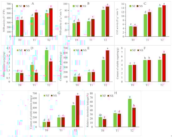 Physiological and biochemical indexes of NS and NF under freezing stress. (A) SOD activity, (B) POD activity, (C) CAT activity, (D) MDA content, (E) free proline content, (F) soluble sugar, (G) soluble protein, (H) REL. Values of p are means ± SD from three biological replicates (p < 0.05). Different lowercase letters (a–e) in the figure represent significant differences in values.