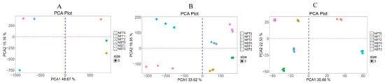 Principal component analysis (PCA) of (A) detected sites in methylation sequencing, (B) detected genes in transcript sequencing, and (C) detected proteins in proteomics sequencing.