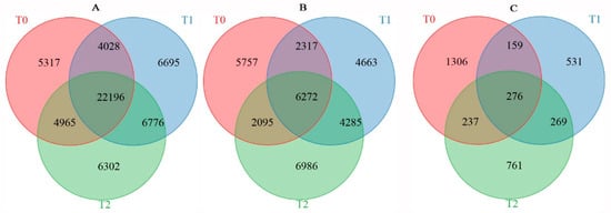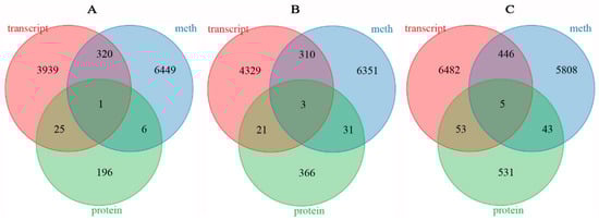Venn diagram of common genes at methylome, transcriptome, and proteome in both T1 and T2 (A), unique T1 (B), and unique T2 (C).