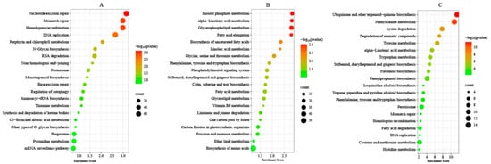 The specific DMGs, DEGs, and DAPs under T1 and T2 freezing stress were subjected to KEGG enrichment analysis in order to understand the cold-tolerance mechanism of winter rapeseed seedings under freezing stress. In total, 122, 120, and 74 KEGG pathways were successfully altered (Tables S6–S8). The KEGG enrichment pathways of DMGs showed that Nucleotide excision repair (ko03420), Mismatch repair (ko03430), Homologous recombination (ko03440), DNA replication (ko03030), and Porphyrin and chlorophyll metabolism (ko00860) were significantly (q < 0.05) enriched (Figure 6). The enrichment pathways of the DEGs exhibited genes mainly enriched in Inositol phosphate metabolism (ko00562), alpha-Linolenic acid metabolism (ko00592), Glycerophospholipid metabolism (ko00564), Fatty acid elongation (ko00062), and the Biosynthesis of unsaturated fatty acids (ko01040) (Figure 6). The result of DAPs showed that Ubiquinone and other terpenoid–quinone biosynthesis (ko00130), Phenylalanine metabolism (ko00360), Lysine degradation (ko00310), Degradation of aromatic compounds (ko01220), Tyrosine metabolism (ko00350), alpha-Linolenic acid metabolism (ko00592), Tryptophan metabolism (ko00380), and Flavonoid biosynthesis (ko00941) were the most enriched (Figure 6). Intriguingly, 69 pathways were enriched in both DEGs and DAPs, of which 52 pathways overlapped with DMGs’ enrichment pathways.