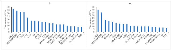 Classification of differentially expressed transcription factors (TFs) in rapeseed seedings. TFs identified in methylome (A), and transcriptome (B) in between both rapeseed cultivars at T1 and T2 freezing stress, respectively.