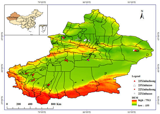 Map of Xinjiang DEM elevation data and location of cotton sampling points in 2022 and 2023.