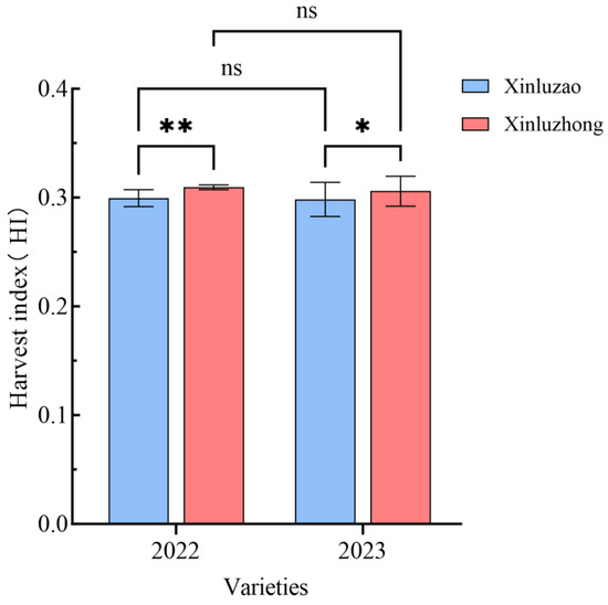 Comparison of the cotton harvest index of the XLzao and XLzhong variety types in 2022 and 2023 (* indicates the statistical significance level: ** p < 0.01, * p < 0.05 and ns: no significant difference).