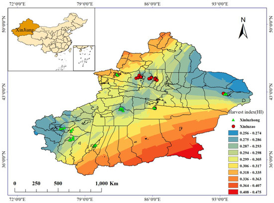 Spatial distribution of the cotton harvest index in Xinjiang.