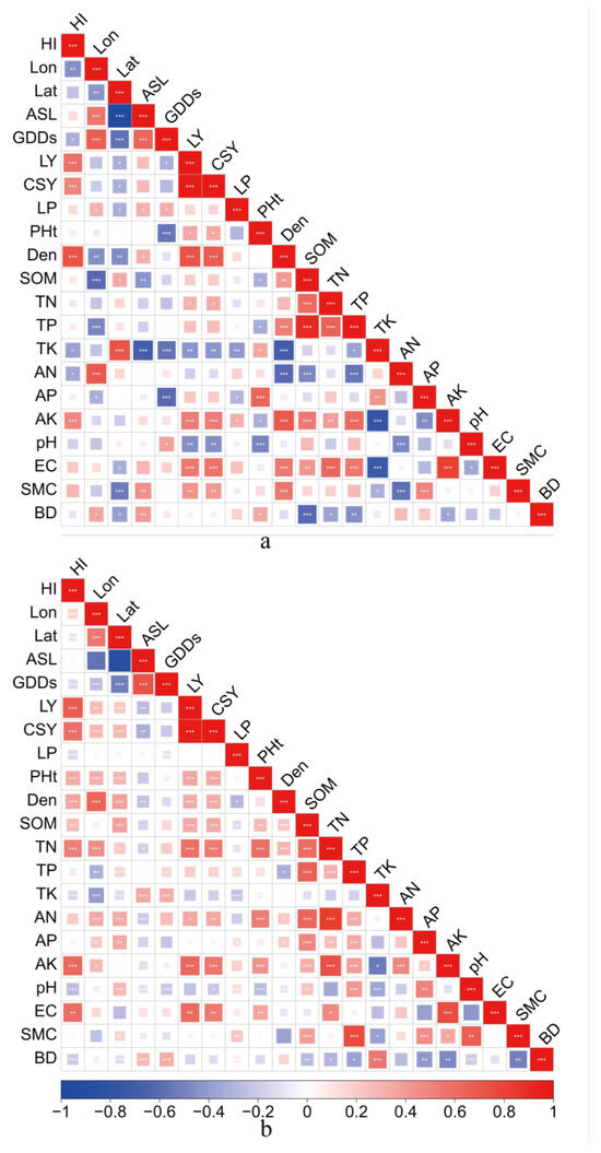 Heat map of intra-group correlation clustering labeling between the cotton harvest index and influencing factors (*** p < 0.001, ** p < 0.01, * p < 0.05). (a) Heat map of the correlation between the HI and influencing factors in the XLzao variety type correlation heat map; (b) correlation heat map between the cotton harvest index of the XLzhong variety types and influencing factors. (The color of the boxes in the figure indicates the strength of the correlation. Red represents a strong positive correlation, while blue indicates a strong negative correlation).