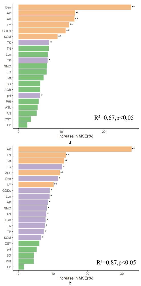 Random forest model prediction of factors influencing the HI. (a) The cotton HI of the XLzao variety types; (b) the cotton HI of the XLzhong variety types. (Different colored bars represent different levels of significance: ** p < 0.01, * p < 0.05).