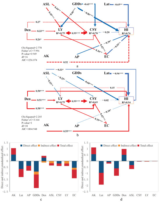 Influencing factors on the cotton HI of the XLzao variety types (a) and the cotton HI of the XLzhong variety types (b). (c) (XLzao) and (d) (XLzhong) show the bar charts of the direct, indirect, and total effect sizes of the factors influencing the cotton harvest index derived through structural equation modeling. R2: the total explanation rate. The numbers on the arrows in the figure indicate the standardized path coefficients; the degree of thickness of the arrows indicates the size of the standardized path coefficients; arrows of different colors indicate positive or negative correlations, with red arrows indicating positive correlations and blue arrows indicating negative correlations (*** p < 0.01, ** p < 0.05, * p < 0.1).
