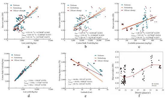 (a) Regression analysis plot of the cotton lint yield and harvest index, (b) regression analysis plot of the cotton stalk yield and harvest index, (c) regression analysis plot of the available potassium and harvest index, (d) regression analysis plot of the cotton lint yield and cotton stalk yield, (e) regression analysis plot of latitude and growing degree days, and (f) the fitting curve of density and the harvest index.
