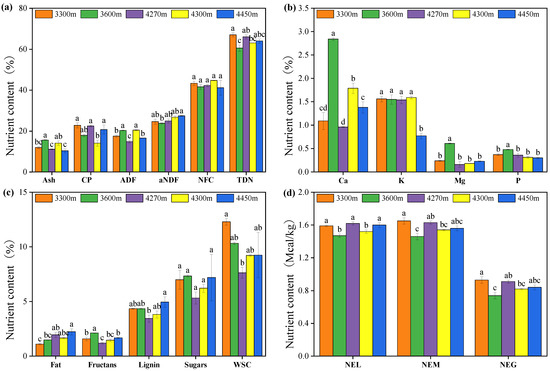 Crop quality of turnip belowground parts at different altitudes. Note: CP−crude protein, ADF—acid detergent fiber, aNDF—amylase-treated neutral detergent fiber, NFC—non-fiber carbohydrates, TDN—total digestible nutrients, WSC—water-soluble carbohydrates, NEL—net energy for lactation, NEM—net energy for maintenance, NEG—net energy for gain. (a) Quality index: Ash, CP, ADF, aNDF, NFC, TDN; (b) Mineral index: Ca, K, Mg, P; (c) Quality index: Fat, Fructans, Lignin, Sugars, WSC; (d) Net energy: NEL, NEM, NEG. Different lowercase letters indicate significant difference (p < 0.05).