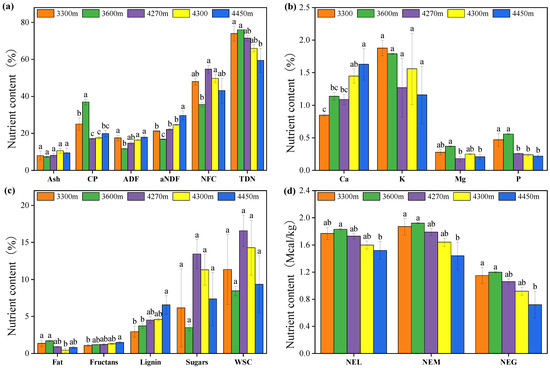Crop quality of turnip aboveground parts at different altitudes. Note: CP—crude protein, ADF—acid detergent fiber, aNDF—amylase-treated neutral detergent fiber, NFC—non-fiber carbohydrates, TDN—total digestible nutrients, WSC—water-soluble carbohydrates, NEL—net energy for lactation, NEM—net energy for maintenance, NEG—net energy for gain. (a) Quality index: Ash, CP, ADF, aNDF, NFC, TDN; (b) Mineral index: Ca, K, Mg, P; (c) Quality index: Fat, Fructans, Lignin, Sugars, WSC; (d) Net energy: NEL, NEM, NEG. Different lowercase letters indicate significant difference among altitude gradients for each index at p < 0.05.