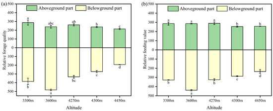 Relative forage quality (a) and relative feed value (b) of turnips at different altitudes. Different lowercase letters indicate significant difference among altitude gradients for above- or belowground parts (p < 0.05).