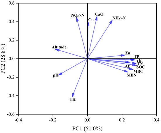 Principal component analysis of altitude and soil chemical properties. Note: SOC—soil organic carbon, AP—available phosphorus, AK—available potassium, TP—total phosphorus, TN—total nitrogen, TK—total potassium, MBC—microbial biomass carbon, MBN—microbial biomass nitrogen.