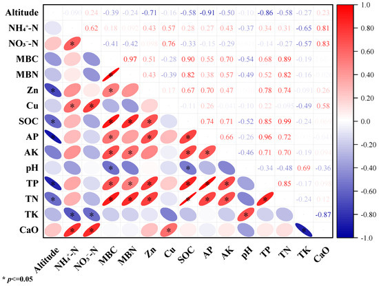 Correlation analysis of altitude and soil chemical properties. Note: SOC—soil organic carbon, AP—available phosphorus, AK—available potassium, TP—total phosphorus, TN—total nitrogen, TK—total potassium, MBC—microbial biomass carbon, MBN—microbial biomass nitrogen.