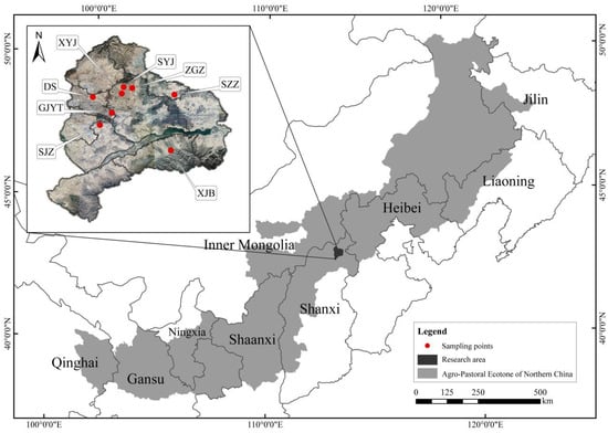 The agro-pastoral ecotone in northern China, located in semi-arid and arid zones with an annual precipitation of 300–400 mm, is characterized by the overlap of agriculture and animal husbandry both spatially and temporally [,]. Yunzhou District (40°06′00.22″ N, 113°34′12.18″ E), one of China’s four main daylily production areas, is located in the middle of the agricultural–pastoral ecotone in northern China (Figure 1), covering 1478 km2. The region has a temperate monsoon continental climate with an average annual temperature of 6.4 °C, precipitation of 392 mm, and a frost-free period of 125 days. The average altitude is 1157 m, and the terrain slopes from northwest to southeast. The dominant soil type, Chestnut-Calcareous, which is characterized by high pH, poor water retention, and low SOC content, covers 86.33% of the presented district area.