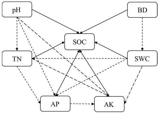 Structural equation modeling (SEM) is a combination of factor analysis and path analysis and is widely used in the analysis of relationships between variables in the covariance matrix of natural ecosystem variables [,,]. Therefore, SEM was used to further analyze the effect of soil physical and chemical properties on SOC variations. A conceptual model illustrating the direct and indirect effects of soil physical and chemical properties on SOC content is shown in Figure 2, which is based on the following assumptions: various physical and chemical properties directly affect SOC; BD directly affects SWC; SWC and pH indirectly affect SOC through TN, AP, and AK; and AP directly affects AK.
