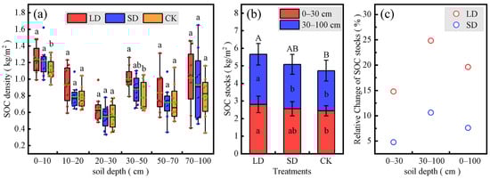 The influence of planting daylilies on the SOC density of the soil profile. (a) The vertical distribution of SOC densities for different treatments, (b) SOC stocks for different treatments in topsoil and bottom soil, and (c) relative change in SOC stocks of LD and SD compared with CK. The box displays 25%, 50%, and 75% values; the line shows the maximum and minimum ranges of normal values; a point outside the line indicates an outlier; and the green line indicates the average value. Whiskers represent the standard deviation. Different lowercase letters indicate significant differences (p < 0.05) between treatments within the same soil layer.