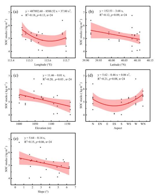 The relationship between geographic factors and SOC stocks at 0–100 cm depth is shown in Figure 4. The relationship between SOC stocks and longitude (Figure 4a, R2 = 0.18, p = 0.13) was a quadratic function, and SOC stocks showed a decreasing trend with increasing longitude. SOC stocks were negatively correlated with latitude (Figure 4b, R2 = 0.12, p = 0.09) and elevation (Figure 4c, R2 = 0.20, p < 0.05). SOC stocks and aspect (Figure 4d, R2 = 0.21, p = 0.08) showed a quadratic function relationship; SOC stocks were higher on the northwest and north slopes and lower on the southeast and south slopes. SOC stocks were negatively correlated with the slope (Figure 4e, R2 = 0.15, p = 0.06).