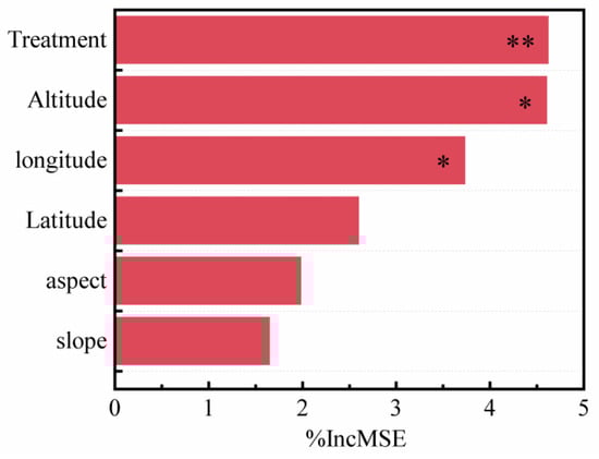 SOC storage is influenced by site effects (including the natural geographic environment of the sampling points) and different treatments (including planting types and planting duration). The random forest analysis revealed that the relative importance of factors influencing SOC stocks at 0–100 cm depth was ranked as follows: treatment > elevation > longitude (p < 0.05, Figure 5). The influence of site effects on SOC stocks at 0–100 cm depth was the sum of the influences of various geographic factors. Therefore, the influence of site effects was greater than that of different treatments. This result is consistent with the conclusions of Rosinger et al., who found that the potential of SOC sequestration in farmlands is mainly affected by site effects rather than management measures []. Consequently, when studying the effects of different crop types on SOC stocks, paired sampling should be considered to minimize the influence of geographic factors on the results.