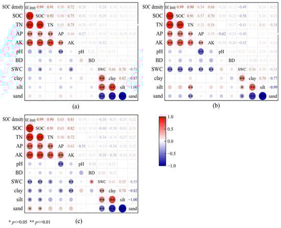 Relationships between SOC density and soil physicochemical properties under (a) LD, (b) SD, and (c) CK. Note: SOS density was processed during the correlation analysis to eliminate the effect of different sampling intervals.