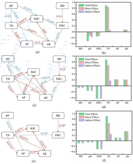 The structural equation model (SEM) and standardized effect sizes of the influence of soil physicochemical properties on SOC under LD, SD, and CK. (a) LD (χ2 = 12.275; df = 10; p = 0.267; RMSEA = 0.070; GFI = 0.938; NFI = 0.933; TLI = 0.970; CFI = 0.986). (c) SD (χ2 = 12.903; df = 10; p = 0.229; RMSEA = 0.079; GFI = 0.929; NFI = 0.934; TLI = 0.965; CFI = 0.983). (e) CK (χ2 = 16.776; df = 13; p = 0.210; RMSEA = 0.079; GFI = 0.916; NFI = 0.921; TLI = 0.968; CFI = 0.980). The graphs in (b,d,f) represent the standardized effect sizes of the impact factors on LD, SD, and CK, respectively. In (a,c,e), solid and dotted lines indicate the direct and indirect effects of soil physical and chemical properties on SOC content, respectively. Blue and red arrows represent negative and positive relationships between variables, numbers adjacent to arrows are standardized path coefficients, and the size of the number indicates the strength of the relationship. * Denotes significance at p < 0.05 level, ** denotes significance at p < 0.01 level, and *** denotes significance at p < 0.001.