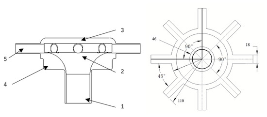 Funnel head distributor, with all dimensions are in mm. 1. Inlet of air–seed mixture flow; 2. Distribution area of the air–seed mixture; 3. Distribution head lid; 4. Shell of the distribution head; 5. Outlet of air–seed mixture flow.