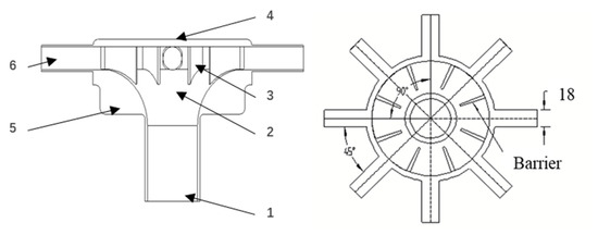 Closed-funnel distributor, with all dimensions in mm. 1. Inlet of air–seed mixture flow; 2. Distribution area of the air–seed mixture; 3. Barrier; 4. Distribution head lid; 5. Shell of the distribution head; 6. Outlet of air–seed mixture flow.