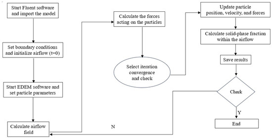 Figure 4 shows the DEM-CFD coupling simulation process. The CFD solver solves the airflow field, and the DEM-CFD coupling method calculates the fluid drag force, gravity, and buoyancy acting on the particles. The particles’ motion state is simulated within each time step. If the simulation time has not reached the set value, the airflow field and particle motion state are iteratively calculated within each time step.
