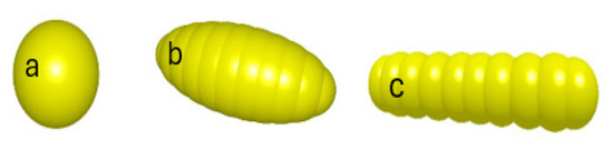 Seed model established through the EDEM software. (a) Rapeseed seed model; (b) wheat seed model; (c) rice seed model.