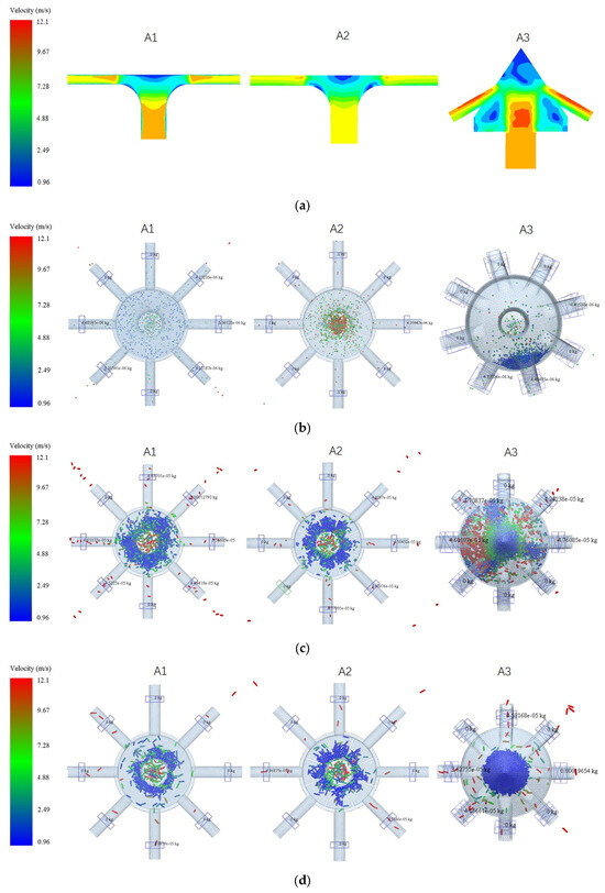 The velocity contours and seed particle distributions show that A1 and A3 exhibit turbulence and an uneven flow distribution across the outlets. This leads to significant differences in feed rates among the outlets, resulting in higher CV values. In contrast, the A2 distributor minimizes turbulence, allowing the rapeseed–air, wheat–air, and rice–air mixtures to pass through with greater uniformity and lower velocity differences across the outlets. Additionally, the A2 distributor reduces the accumulation of seed particles at the outlets compared to A1 and A3, further enhancing distribution consistency.