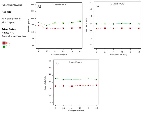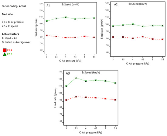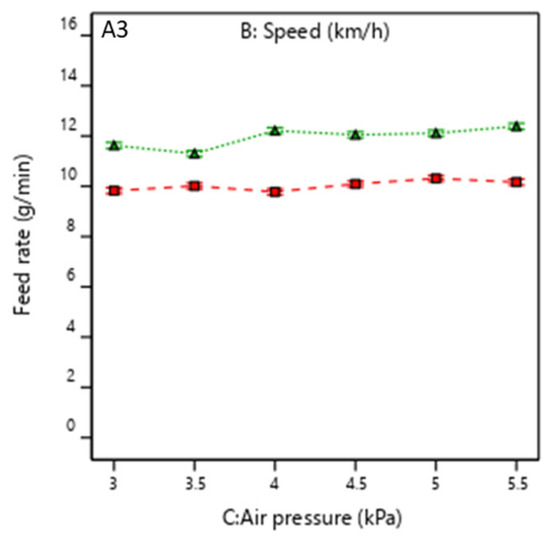 In Figure 11, similar to the wheat–air mixture, A1 and A3 show more pronounced variability in feed rates as a function of speed and pressure. At the same time, A2 demonstrates greater consistency, with less fluctuation across different conditions. In relation to A1 and A3, the feed rate for the 5 km/h speed condition increases significantly at higher speeds and air pressures.