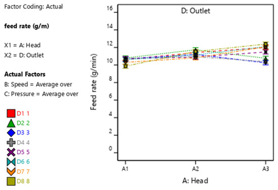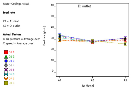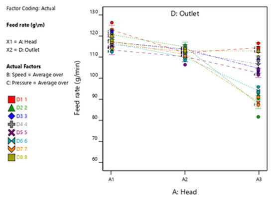 For rapeseed, the ANOVA table (Table 8) results indicate that the A—Head shows a significant influence on feed rate variation (F-value = 207.42, p < 0.0001), implying that the design of the distributor head plays a crucial role in determining the overall efficiency of the distribution system.