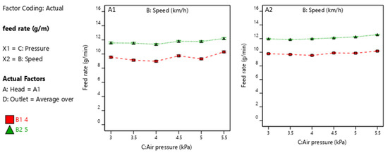 Figure 13 shows that A1 and A3 experience a relatively wider range of feed rates compared to A2. A2 maintains a more stable and consistent performance. A2 demonstrates the least variation in feed rates across the different pressure levels and speeds, as proven by the nearly flat trend lines in Figure 13. In turn, this proves that A2 provides a more uniform distribution of rapeseed, reducing the variability caused by air pressure and speed fluctuations. The variation in feed rates across the eight outlets is an important indicator of how uniformly the rapeseed is distributed. An analysis of the coefficient of variation (CV) for A1, A2, and A3 revealed values of 0.3%, 0.1%, and 1%, respectively, among the outlets, illustrating that A2 has the lowest variation in feed rate compared to both A1 and A3, indicating a more consistent performance across outlets.