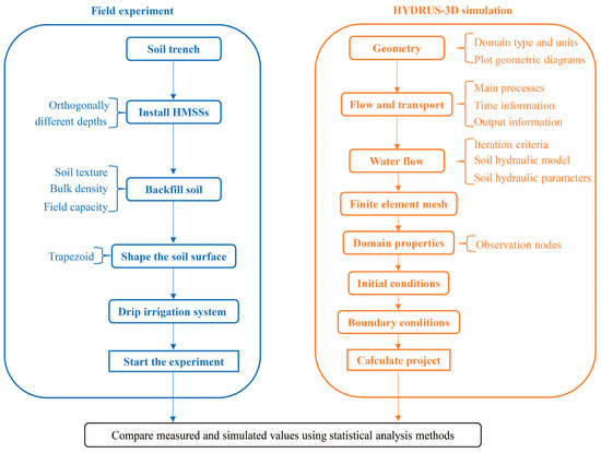 Diagram depicting the steps of the field experiment and flowchart of the HYDRUS-3D simulation.