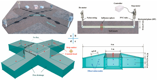 The detailed procedure of the HYDRUS-3D (Version 2.04) simulation is illustrated in Figure 1. Three-dimensional-General geometry was employed to model and delineate intricate three-dimensional geometries of the test area (Figure 2c,d). To simulate dripper water penetration in three-dimensional space, the drippers were represented as a circular region matching their actual spatial position and marked on the surface of the geometric model. Soil sampling and analysis during the experimental installation process provided input data, including soil textural classification (3.18% clay (0–2 μm), 69.74% silt (2–50 μm), and 27.08% sand (50–2000 μm)), bulk density (1.29 g cm−3), and field capacity (0.20 cm3 cm−3). These inputs were used in the Rosetta model to predict hydraulic parameters (Table 1).