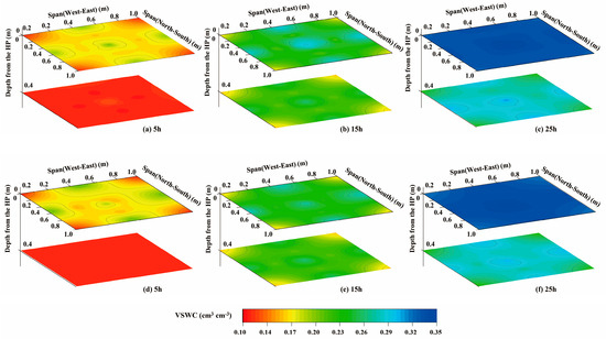 Comparison of measured (a–c) and simulated (d–f) results for volumetric soil water content (VSWC) at soil depths of 0.20 m and 0.40 m from the horizontal plane (HP) at different times (5 h, 15 h, 25 h) following the irrigation event.