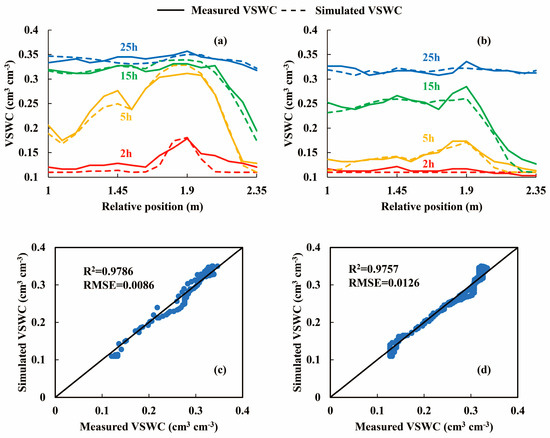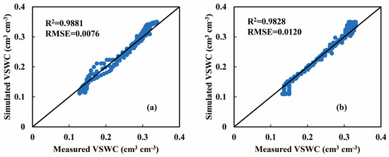 Comparison of the simulated and measured VSWC at depths of 0.20 m (a) and 0.4 m (b) below the horizontal plane (HP) directly under the drip emitter.