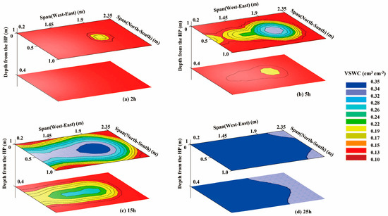 Simulations of VSWC in slope areas at 2, 5, 15, and 25 h after irrigation.