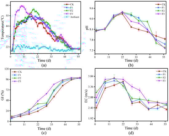 pH fluctuations followed a typical trend, initially increasing and then stabilizing, as shown in Figure 1b. This trend is attributed to the rapid degradation of organic acids and mineralization of organic nitrogen, followed by ammonia volatilization and nitrification [27,28]. Throughout composting, pH remained between 7.31 and 9.38, supporting microbial growth and activity [29]. pH peaked on day 22 at 9.28 (CK), 9.34 (F1), 9.38 (F2), and 9.40 (F3), then declined to 7.85, 7.56, 7.36, and 7.32, respectively, at the final stage. These fluctuations are linked to alkaline bacterial proliferation [19]. Specifically, the pH values recorded were as follows: 9.28 for CK, 9.34 for F1, 9.38 for F2, and 9.40 for F3. By the end of the composting process, the pH values had shifted to 7.85 for CK, 7.56 for F1, 7.36 for F2, and 7.32 for F3. These fluctuations are attributed to alkaline bacterial growth in compost [24]. Notably, all values met regulatory limits ensuring compliance with agricultural safety standards [28].
