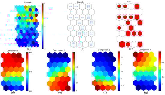 PARAFAC-SOM analysis of four organic components: (a) U-matrix; (b) sample distribution; (c) multiple-hit histogram; (d–g) fluorescence intensity maps of Components 1–4. The U-matrix visualizes sample similarity, where identical neurons indicate similar fluorescence properties. Color shifts from blue to red denote increasing fluorescence signal variation. In intensity maps, redder hues indicate higher fluorescence levels. CK-1 represents day 1 of the control group, with other labels following the same format.