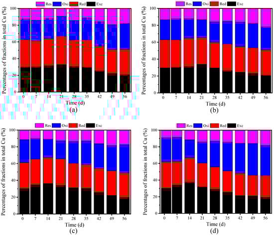Cu speciation under different treatments: (a) CK (control without BC); (b) F1 (8% BC); (c) F2 (10% BC); (d) F3 (12% BC).