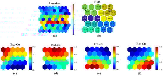 Fmax%-SOM analysis of Cu: (a) U-matrix; (b) best matching unit (BMU); (c) Exc-Cu; (d) Red-Cu; (e) Oxi-Cu; (f) Res-Cu fluorescence intensity mapping. The U-matrix represents sample similarity, where samples in the same neuron share fluorescence characteristics. Color transitions from blue to red indicate increasing fluorescence signal differences, with redder hues signifying lower similarity. In fluorescence maps, blue-to-red shifts denote rising fluorescence intensity, reflecting higher Cu concentrations. CK-1 represents the day 1 sample from the control without BC; all other labels follow this format.