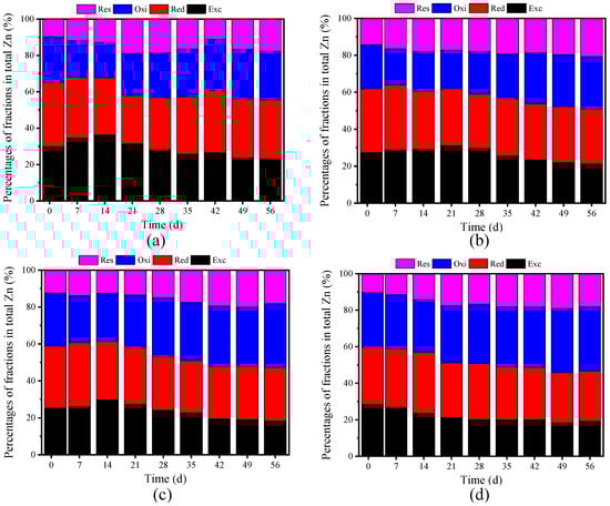 Zn speciation under different treatments: (a) CK (control without BC); (b) F1 (8% BC); (c) F2 (10% BC); and (d) F3 (12% BC).