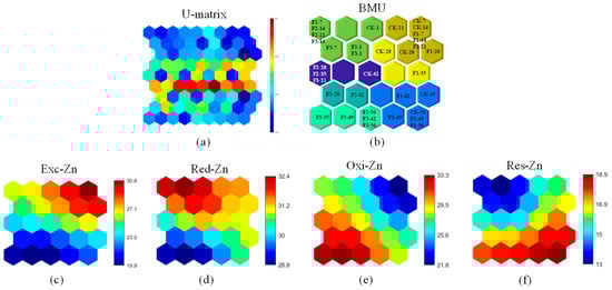 Fmax%-SOM analysis of Zn: (a) U-matrix; (b) best matching unit (BMU); and fluorescence intensity maps for (c) Exc-Zn; (d) Red-Zn; (e) Oxi-Zn; and (f) Res-Zn. The U-matrix illustrates sample similarity, where samples in the same neuron exhibit comparable fluorescence characteristics. Color shifts from blue to red indicate increasing fluorescence differences, with redder hues denoting lower similarity. In intensity maps, a blue-to-red transition signifies enhanced fluorescence, reflecting higher Zn content. CK-1 represents the day 1 sample from the control without BC, with all other labels following this format.