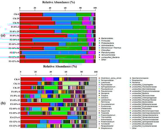 High-throughput 16S rRNA gene sequencing targeting the V3-V4 regions was employed to assess the impact of BC addition on PM composting. Samples for bacterial genomic analysis were collected from the thermophilic and thermotolerant phases. A total of 2030 unique operational taxonomic units (OTUs) were identified, with a sequence similarity threshold of 97%. At the phylum level (Figure 7a), nine dominant bacterial phyla were identified, primarily Bacteroidetes (2.49–62.66%), Firmicutes (9.51–85.81%), Proteobacteria (1.36–34.71%), and Actinobacteria (3.99–17.15%). These findings align well with previous research, highlighting the crucial role these bacterial phyla play in compost degradation [40]. Moreover, the results indicate that BC addition did not significantly alter the distribution of these dominant microbial groups. At the start of composting, Firmicutes were the most abundant phylum, with relative abundances of 44.27% (CK-0), 45.43% (F1-0), 60.06% (F2-0), and 85.81% (F3-0). Significantly, Firmicutes levels increased with rising BC content. During the thermophilic phase, Bacteroidetes emerged as the dominant phylum in CK-29 (42.23%), F1-29 (45.78%), and F2-29 (51.27%), whereas Firmicutes remained dominant in F3-29 (40.54%). In the maturity phase, Proteobacteria became predominant in F2-25 (34.32%), while Bacteroidetes remained dominant in CK-25 (46.63%), F1-25 (62.66%), and F3-25 (39.45%).