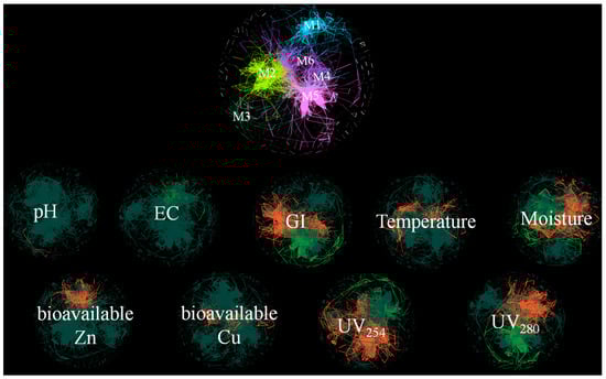 Principal components analysis (PCA) was employed for dimensionality reduction, classifying composting microorganisms into six primary modules (M1, M2, M3, M4, M5, M6). Network analysis (Figure 8) illustrates correlations between microbial modules and compost physicochemical properties, HMs, UV254, UV280, and other composting factors. UV254 symbolizes humic substance content and UV280 indicates protein content in the compost matrix [43]. The percentage of correlated genera is provided (see Supplementary Materials). In M1, M4, M5, and M6, 13.29–29.37% of genera exhibit a positive correlation with pH, whereas M2 and M3 display a negative correlation. A similar trend has been reported in previous studies, where microbial community shifts were associated with pH changes due to microbial metabolic activity and organic matter degradation [1]. M6 is positively correlated with EC, while M5 shows limited correlation. M1-M4 exhibit negative correlations with EC, with M2 demonstrating the strongest correlation (40% of correlated genera). However, the correlation between pH and EC is not statistically significant, suggesting that compost microorganisms exert limited influence on these factors and are inadequate for determining the compost maturation period (Figure 8). M6 demonstrates a strong negative correlation with GI (62.24% of correlated genera), whereas the remaining modules exhibit positive correlations, especially M3 (77.62%), followed by M2 (70.63%) and M5 (58.04%) (see Supplementary Materials). This underscores the substantial role of microbial communities in influencing GI. M5 exhibits a strong positive correlation with temperature, while M1 and M3 also show significant positive correlations, suggesting that these modules contribute to microbial thermophilic activity and enzymatic degradation of organic matter [14]. Conversely, M3 is negatively correlated with moisture (76.84% of correlated genera). Moisture is also negatively correlated with M2 but positively correlated with M6, supporting findings that microbial community composition is highly sensitive to moisture levels, influencing metabolic pathways and enzymatic reactions.