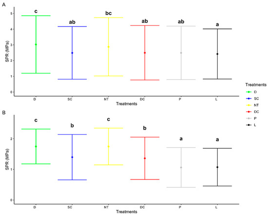 Seasonal total profile SPR for (A) wheat and (B) sunflower for the 2018/19 and 2020/21 growing seasons, respectively, under various tillage treatments. D—disking, SC—shallow cultivation, NT—no-till, DC—deep cultivation, L—loosening, P—plowing. SPR mean values with the same lowercase letter indicate no significant difference at p > 0.05. Error bars show the standard deviation of the mean.