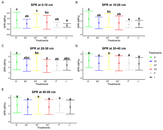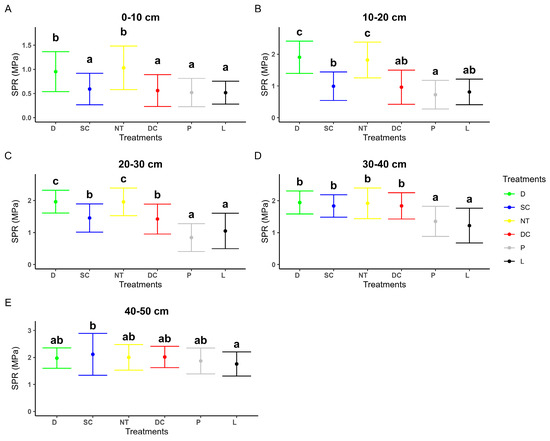 Average SPR at various soil depths measured in 2020/21 sunflower cropping season at different depths: (A) 0—10 cm, (B) 10—20 cm, (C) 20—30 cm, (D) 30—40 cm, and (E) 40—50 cm. D—disking, SC—shallow cultivation, NT—no-till, DC—deep cultivation, L—loosening, P—plowing. SPR mean values with the same lowercase letter indicate no significant difference at p > 0.05. Error bars show the standard deviation of the mean.