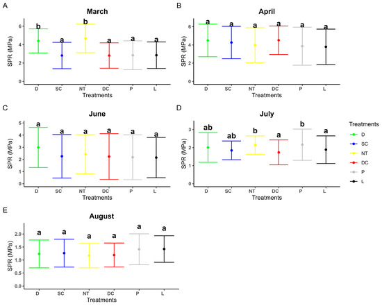 Plots representing monthly temporal mean SPR variations measured in 2019; wheat cropping season from March to August. (A) March, (B) April, (C) June, (D) July, and (E) August. D—disking, SC—shallow tine cultivation, NT—no-till, DC—deep tine cultivation, L—loosening, P—plowing. SPR mean values with the same lowercase letter indicate no significant difference at p > 0.05. Error bars show the standard deviation of the mean.