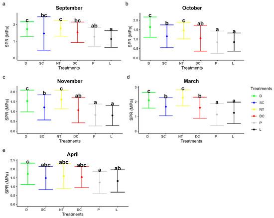 Monthly temporal average SPR variations measured in 2020/21 sunflower cropping season between September 2020 and April 2021. (a) September, (b) October, (c) November, (d) March, and (e) April. D—disking, SC—shallow cultivation, NT—no-till, DC—deep tine cultivation, L—loosening, P—plowing. SPR values with the same lowercase letter indicate no significant difference at p > 0.05. Error bars show the standard deviation of the mean.