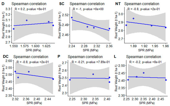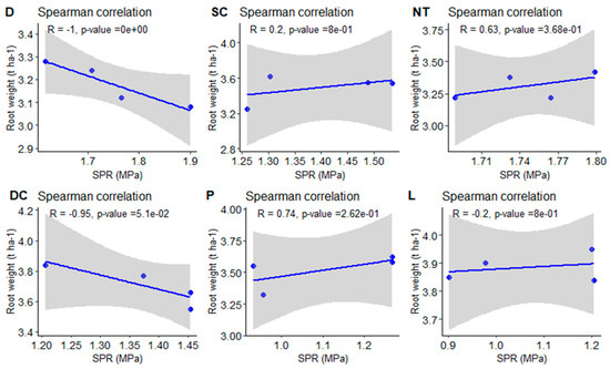 Spearman correlation between root weight and SPR. The following letters represent tillage treatments: D—disking, SC—shallow cultivation, NT—no-tillage, DC—deep cultivation, P—plowing, L—loosening.